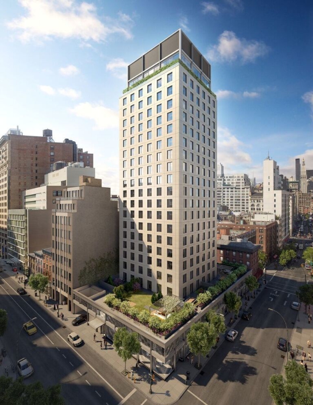 « À 22 étages, 21 East 12th Street est plus grand que la plupart des constructions basses voisines et un peu en retrait sur un podium jardin extérieur, qui maximise la lumière et les vues pour les résidents tout en apportant la lumière du soleil au jardin et aux rues », a expliqué Billy Macklowe, PDG de William Macklowe Company. « Les espaces verts de l’immeuble sont un connecteur entre les deux parcs du quartier, Union Square Park, au nord, et Washington Square Park, au sud ».